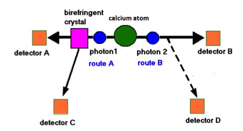 Along the path “A”, a birefringent crystal, that acts as a filter, is inserted from time to time. When the photon interacts with the crystal it can be deflected with a probability of 50%, or it can cross the crystal continuing undisturbed on its way. At the end of each path a photon detector is placed that allows the detection of the photons. The amazing thing that Aspect observed was that when, along the path A, the birefringent crystal was inserted and a deviation of the photon 1 occurred to the detector C, on the path B, also the photon 2 (without “obstacles” in front) deflected “spontaneously” and “instantly” toward the detector D. Basically, the act of introducing the birefringent crystal, with the consequent deviation of the photon 1, made instantly and remotely deflect the photon 2.